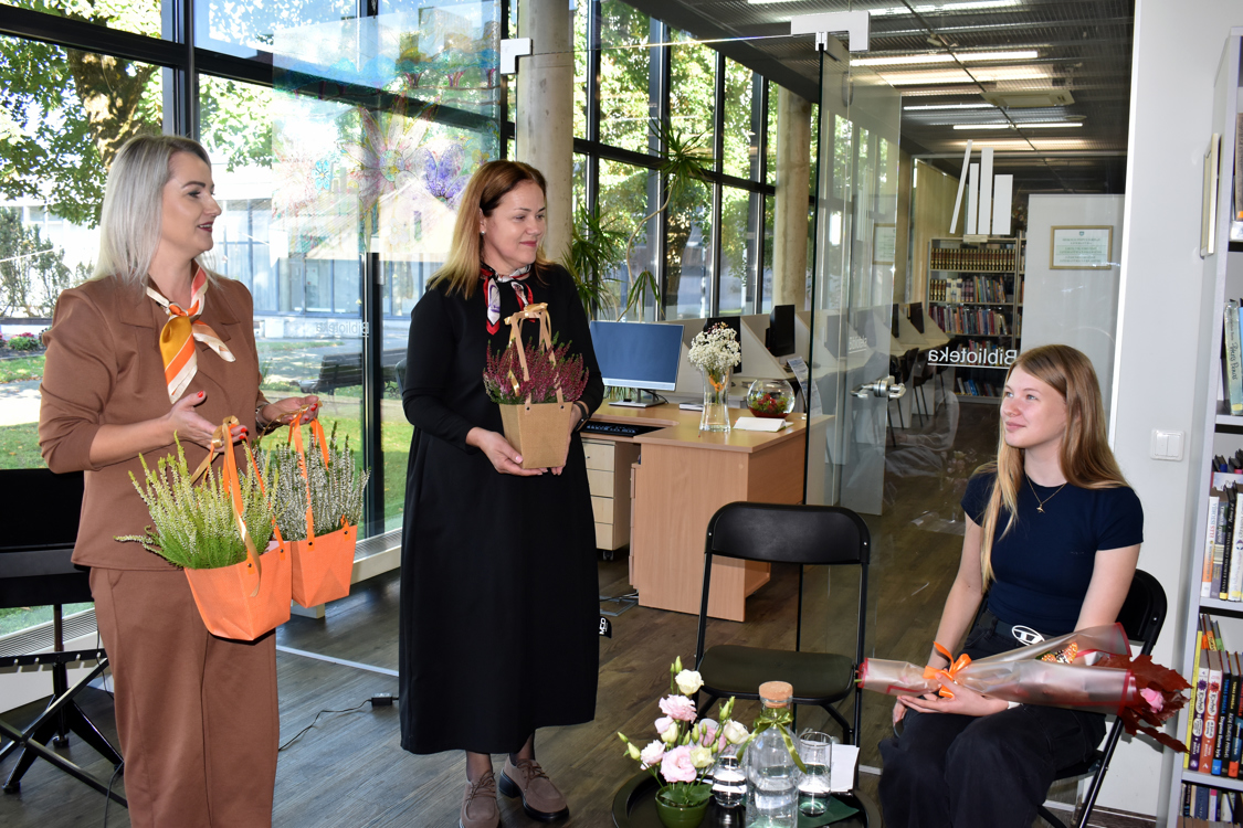 „Ačiū, pirmiausia, Tau, Auguste, už drąsą, už tai, kad atvėrei bibliotekos duris ir pasidalinai savo kūryba. Taip pat nuoširdi padėka skiriama mokytojai, mamytei, artimiesiems, draugams ir visiems, kurie palaikė Tave šioje kūrybos kelionėje. Dėkojame jaunajai atlikėjai Rugilei, muzikos akordais užliejusiai širdis. Išmokime matyti grožį ten, kur anksčiau jo nematėme.“ – šiais žodžiais dėkojo ir parodos autorei Augustei, jos mokytojai p. Liucijai bei jaunajai atlikėjai Rugilei simbolines dovanėles įteikė bibliotekos direktorė Inga Kuzmarskienė.