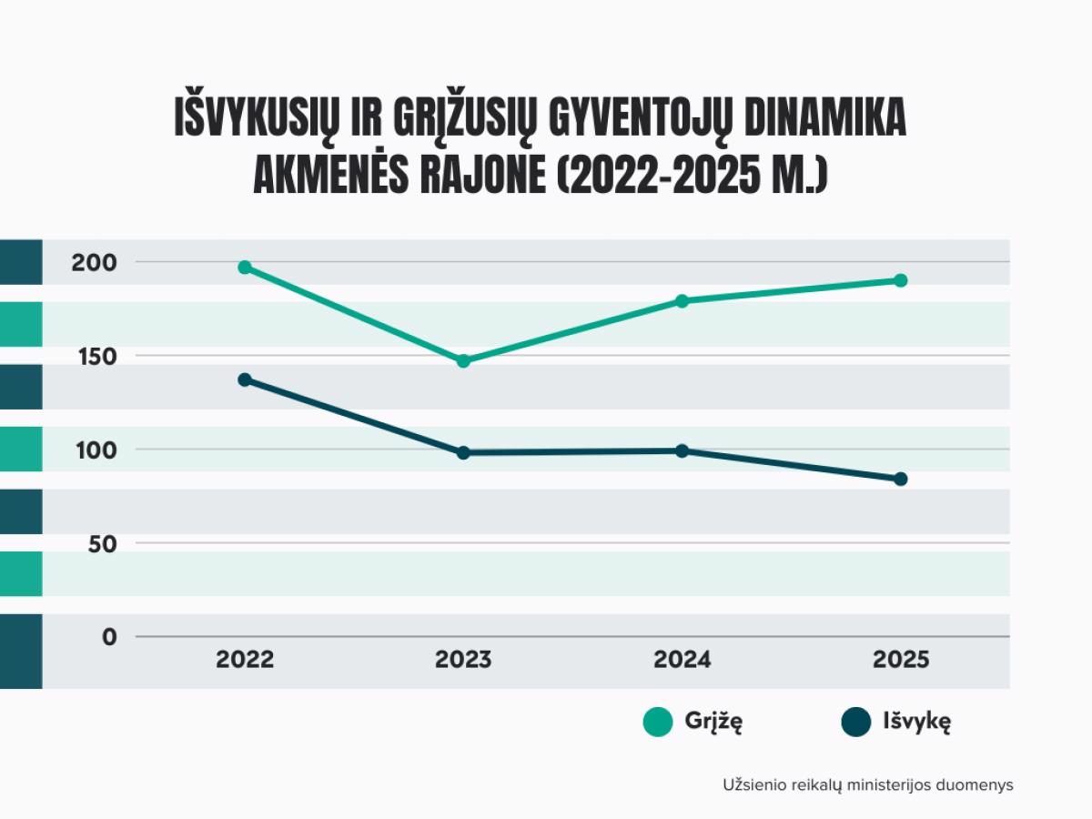 Duomenys rodo, kad 2022 m. iš Akmenės rajono išvyko 137 gyventojai, 2023 m. – 98, 2024 m. – 99, o 2025 m. – 84. Tuo pačiu laikotarpiu į rajoną grįžo gerokai daugiau žmonių: 2022 m. – 197, 2023 m. – 147, 2024 m. – 179, o 2025 m. – net 190 gyventojų. Tai rodo stabilų ir augantį grįžimo į gimtąjį kraštą pasirinkimą.