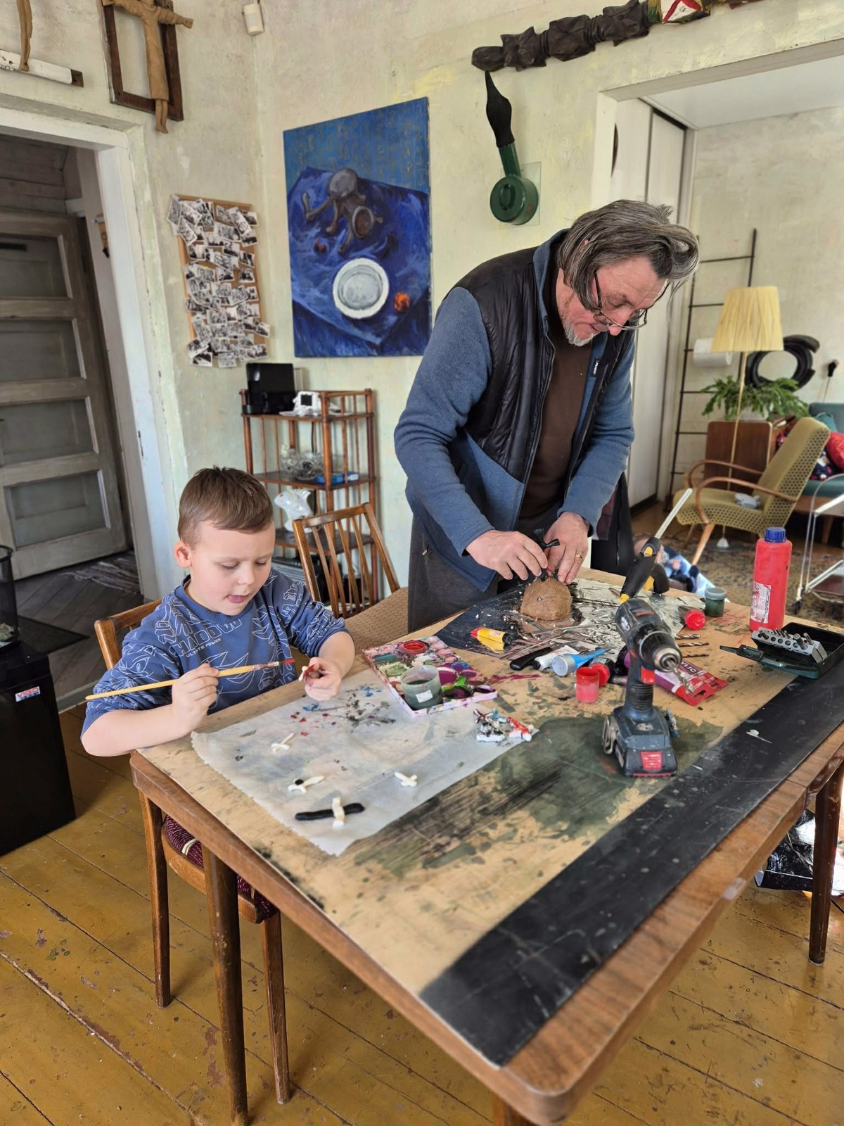 Senelis kantriai rodo, anūkas susikaupęs kartoja. Mažos rankos mokosi, didelės - saugo ir padrąsina. Ant stalo gimsta darbas, tačiau kartu gimsta ir tai, ko neįmanoma parodyti jokioje ekspozicijoje - pasitikėjimas, artumas ir bendrystė.