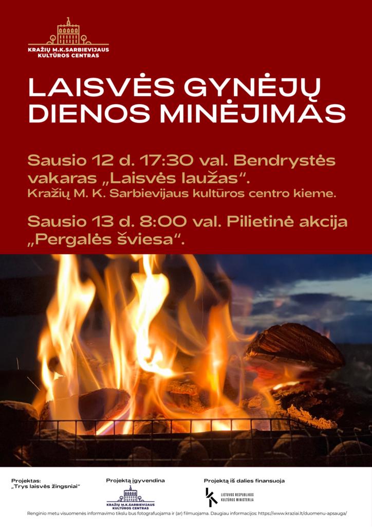 Sausio 12 d. 17.30 val. kviečiame į bendrystės vakarą „Laisvės laužas“, kuris vyks Kražių M. K. Sarbievijaus kultūros centro kieme. Susiburkime drauge, prisiminkime istoriją, pajuskime bendrystę ir laisvės vertę.