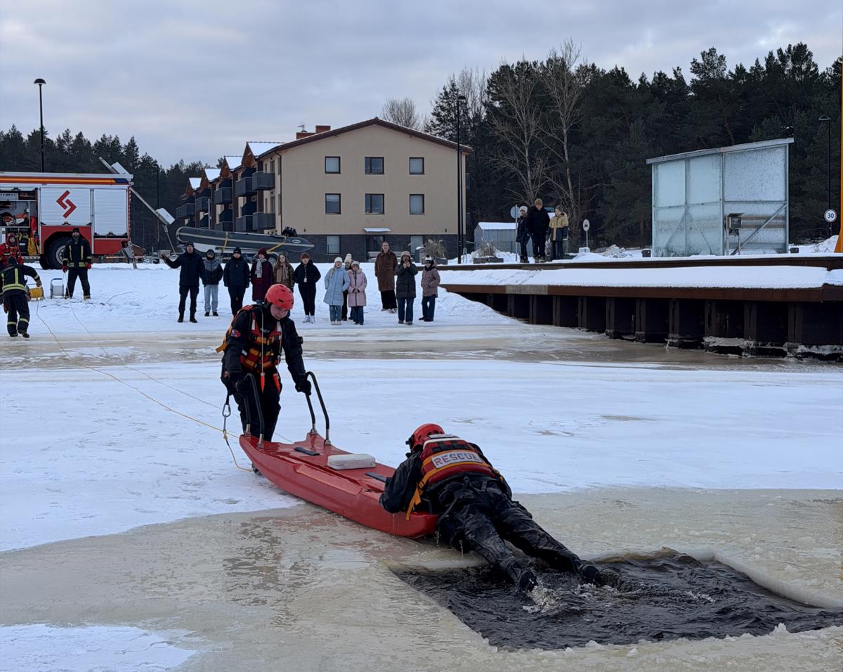 Palangos priešgaisrinės gelbėjimo tarnybos ugniagesiai gelbėtojai praktiškai pademonstravo veiksmus, kurių reikia imtis įlūžus ledui. Iškirstoje eketėje buvo parodyta, kaip savarankiškai išlipti iš vandens, kaip teisingai šliaužti ledu, siekiant sumažinti apkrovą ledo paviršiui, bei aptartos kitos galimos išsigelbėjimo iš vandens ir saugaus pasitraukimo galimybės. Be to, moksleiviams buvo pristatyta Palangos priešgaisrinės gelbėjimo tarnybos naudojama specialioji gelbėjimo technika ir įranga, atsakyta į jiems kilusius klausimus.